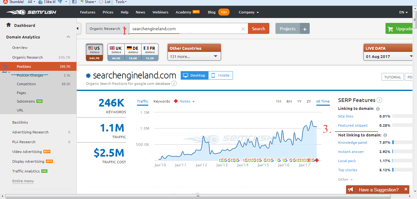 #1. Enter the competitor’s domain in the organic research search bar (marked in image as position 1)