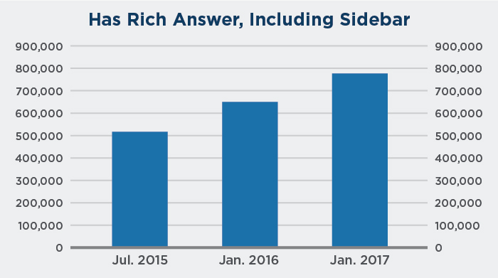 According to the Stone Temple Consulting at present 30% of Google search results contain featured snippets. These snippets appear above the normal search results, that is why they are called position 0 rankings. The prominence of rich answer continuing to grow, it’s time you also include optimization of your pages to be included in rich snippets. Here is a graph showing the growth of rich answers in Google’s search results: