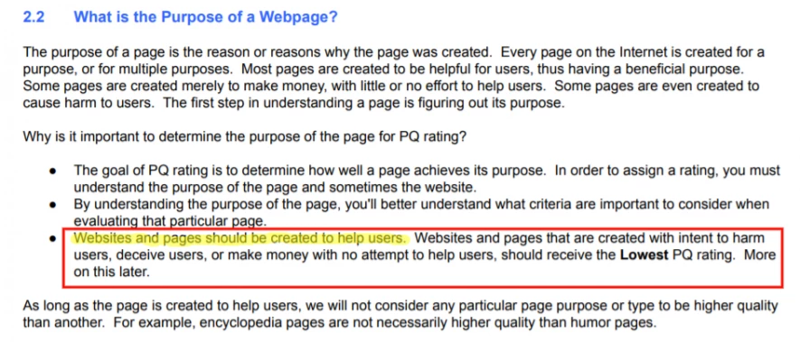 If you have a webpage that is created only with the sole motive of making money and with no attempt to help users, it will be inevitably marked as the lowest quality page.
